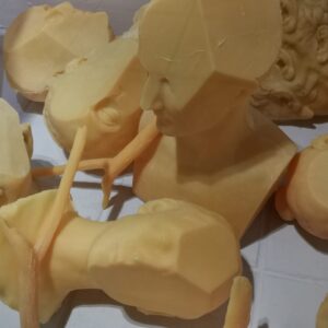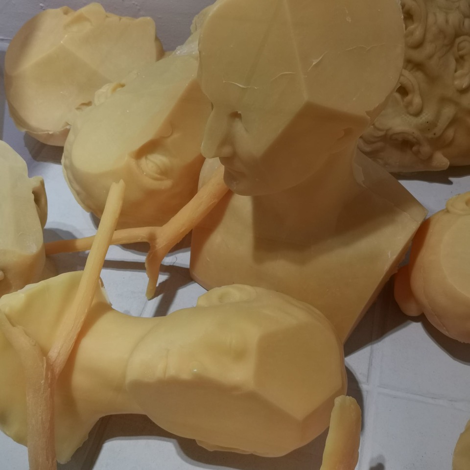 Una costellazione silenziosa di teste in cera si distende nello spazio. Alcune richiamano la statuaria antica, altre ritraggono persone vicine all’artista. I volti appaiono mutilati: porzioni di materia sottratte al viso e alla nuca ne incrinano la fisionomia. La sottrazione non è gesto distruttivo, ma di apertura: la forma non viene negata, ma dischiusa, attraversata.