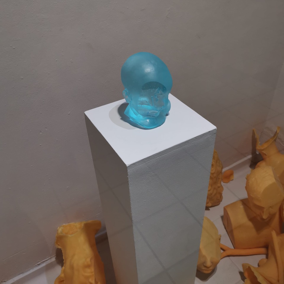 In mezzo a loro, su un plinto, la testa di un bambino realizzata in vetro – materiale inedito nella pratica dell’artista, utilizzato per la prima volta. Anch’essa è mutilata, ma qui la trasparenza muta la qualità del vuoto: ciò che nella cera è sottrazione, nel vetro diventa attraversamento e luce. Il vuoto si rende visibile come luminosità. Non colma, non compensa: trasfigura. La testa vitrea suggerisce un’altra esperienza dell’interno, dove il vuoto si manifesta: l’assenza non si contrappone alla presenza ma ne rivela la sostanza mobile e immanente. In questa tensione, la forma si apre a una dimensione in cui assenza e presenza sono aspetti coesistenti della stessa realtà, metamorfica nel suo incessante fluire.